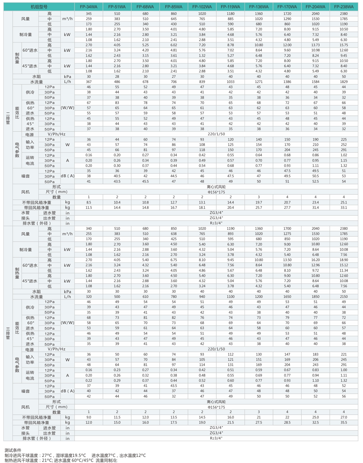 供冷量是在進(jìn)風(fēng)干球溫度27℃,濕度溫度19.5℃,進(jìn)水溫度7℃,出水溫度12℃條件下測(cè)試所得。